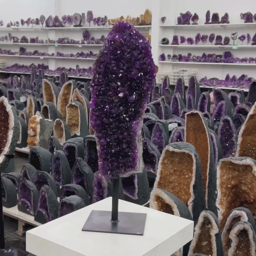 Large Extra Amethyst Druze with Golden Rutile Inclusion on Black Metal Base 19.300 kg